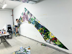 The composition contains visual gradients: Some triangles contain line drawings made by the participants. These are placed next to collage mosaics which connect visually through black lines of negative space between the tiles, which lead to full paintings. Likewise, the imagery depicts seedlings, flowering plants, and fruit / vegetables. The mural thereby links the creative process in the visual arts to that of nature.